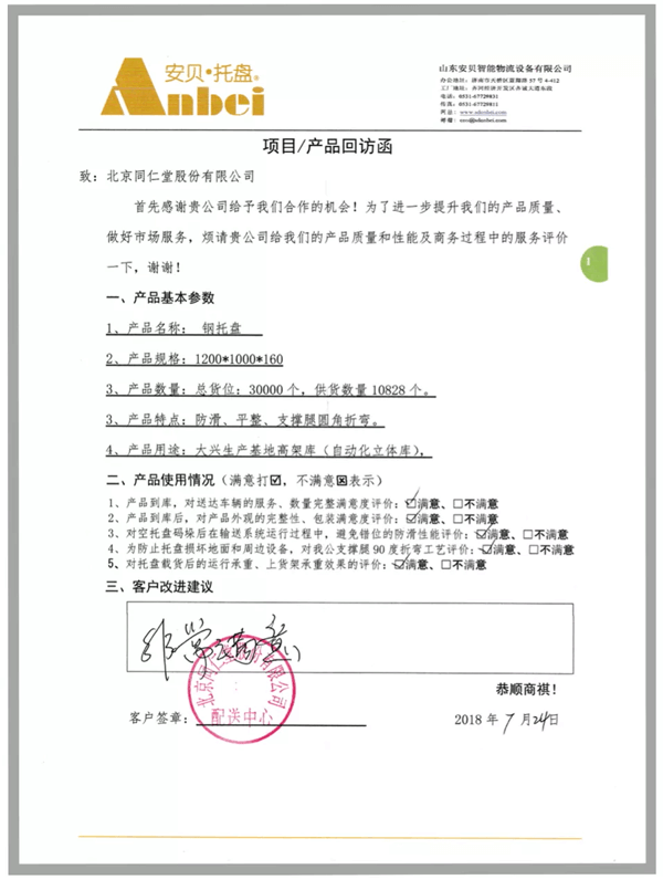 安貝為北京同仁堂藥業(yè)立體庫項目的30000個貨位配套了鋼托盤產(chǎn)品,得到了北京同仁堂領(lǐng)導(dǎo)的高度評價